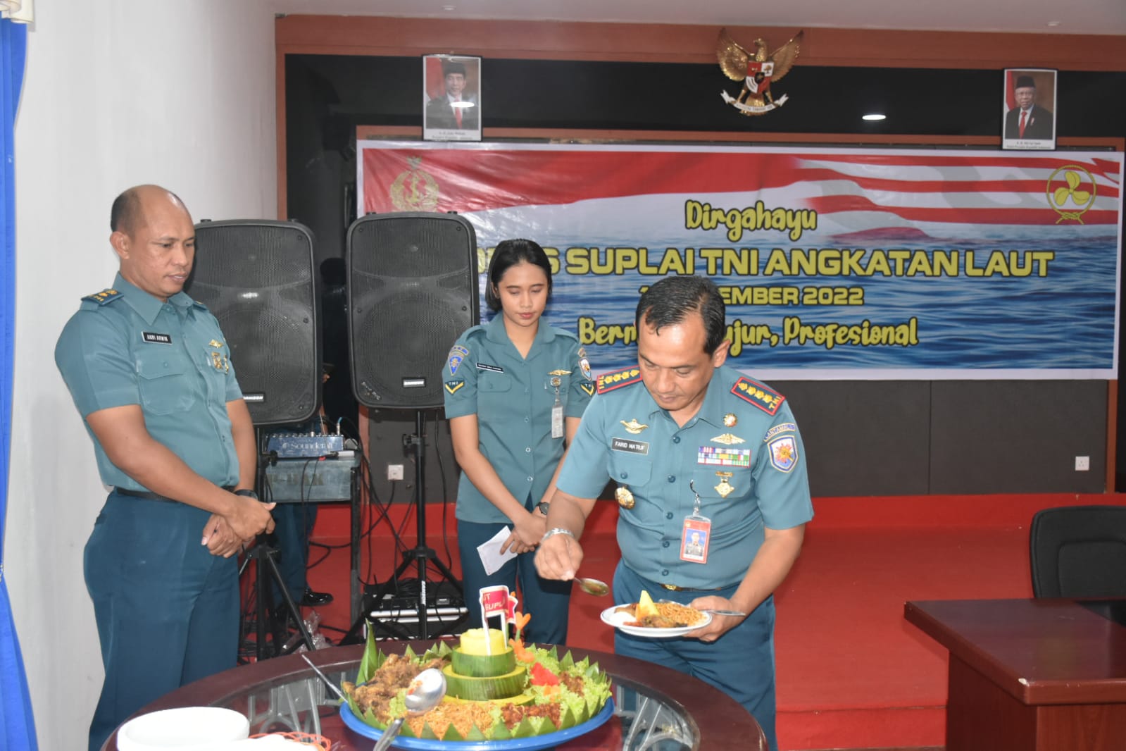 Acara Syukuran HUT Ke-74 Korps Suplai TNI AL diakhiri pemotongan dan penyerahan tumpeng oleh Komandan Lanal Batam kepada perwakilan Korps Suplai serta foto bersama.