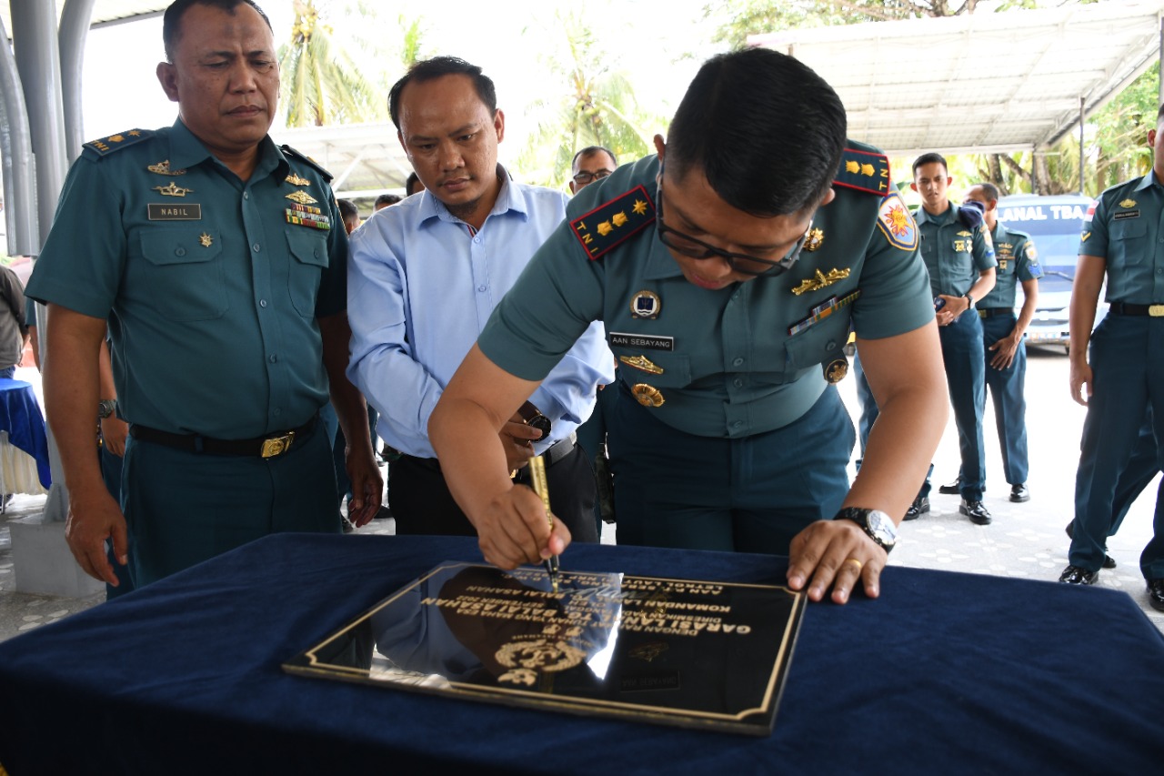Jacindonews | Tanjung Balai — Danlanal Tanjung Balai Asahan Letkol Laut (P) Aan Prana Tuah Sebanyang, S.E., D.W.C., resmikan bangunan garasi kendaran di Ksatrian Mako Lanal Tanjung Balai Asahan, Jalan Tanjung Berombang Asahan Mati, Kecamatan Tanjungbalai, Kabupaten Asahan, ditandai dengan penandatangan prasasti, Jumat (16/09/2022).
