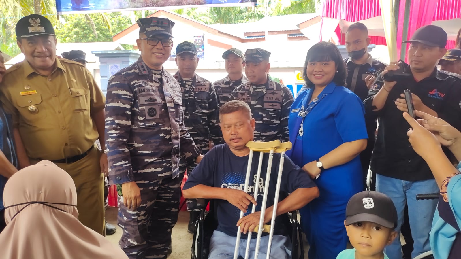 Komandan Lanal Tanjung Balai Asahan Letkol Laut (P) Aan Prana Tuah Sebayang, SE., D.W.C., bersama Forkopimda Asahan dan Ketua Cabang 7 Korcab I DJA I Ny. Elisa Aan Sebayang saat meninjau kegiatan tersebut, secara simbolis memberikan paket susu untuk balita dan memberikan 6 buah kursi roda kepada yang berhak menerima.