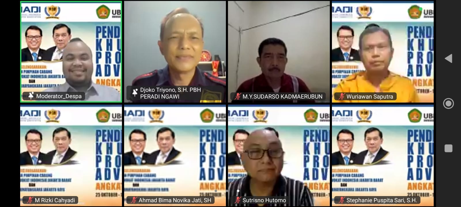 Jumat (15/11/2024), pukul 19.00 WIB, secara online, dilaksanakan kelas PKPA dengan materi Pelayanan Hukum Pro Bono. Adapun pemateri adalah Djoko Priyono, S.H. (Ketua PHB Peradi Ngawi). Dalam memaparkan materinya, Djoko Priyono mengatakan bahwa seorang pengacara harus melayani masyarakat pencari keadilan yang tidak mampu.