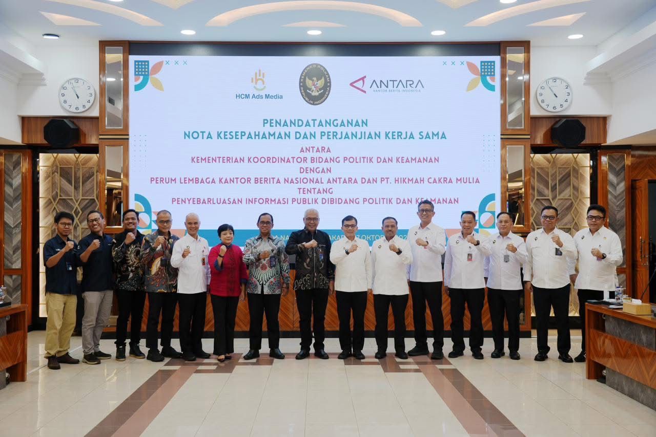 JAKARTA | JacindoNews – Kementerian Koordinator Bidang Politik dan Keamanan melaksanakan penandatanganan Nota Kesepahaman dan dan Perjanjian Kerja Sama dengan Perum Lembaga Kantor Berita Nasional (LKBN) Antara dan PT Hikmah Cakra Mulia tentang Penyebarluasan Informasi Publik di Bidang Politik dan Keamanan.
